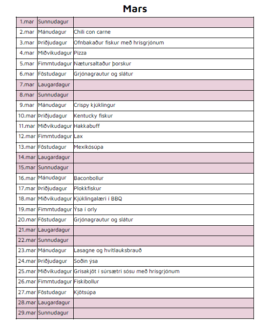 Matseðill fyrir mars 2026